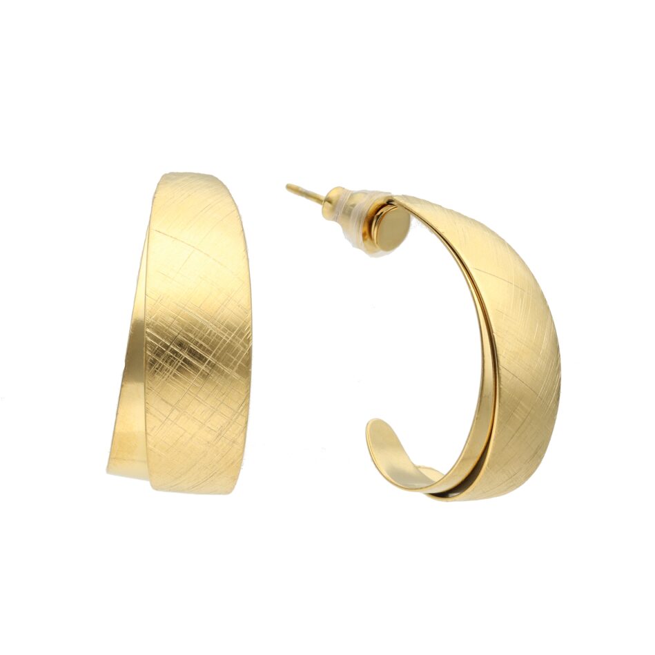 Deze dubbele creolen vallen op door hun matte en glanzende structuur. Dit zorgt ervoor dat ze bij elke beweging het licht op een andere manier vangen. De gemixte afwerking tussen mat en glimmend geven deze oorbellen een speels effect. De oorbellen zijn gemaakt van stainless steel, dus zijn waterproof en verkleuren niet!