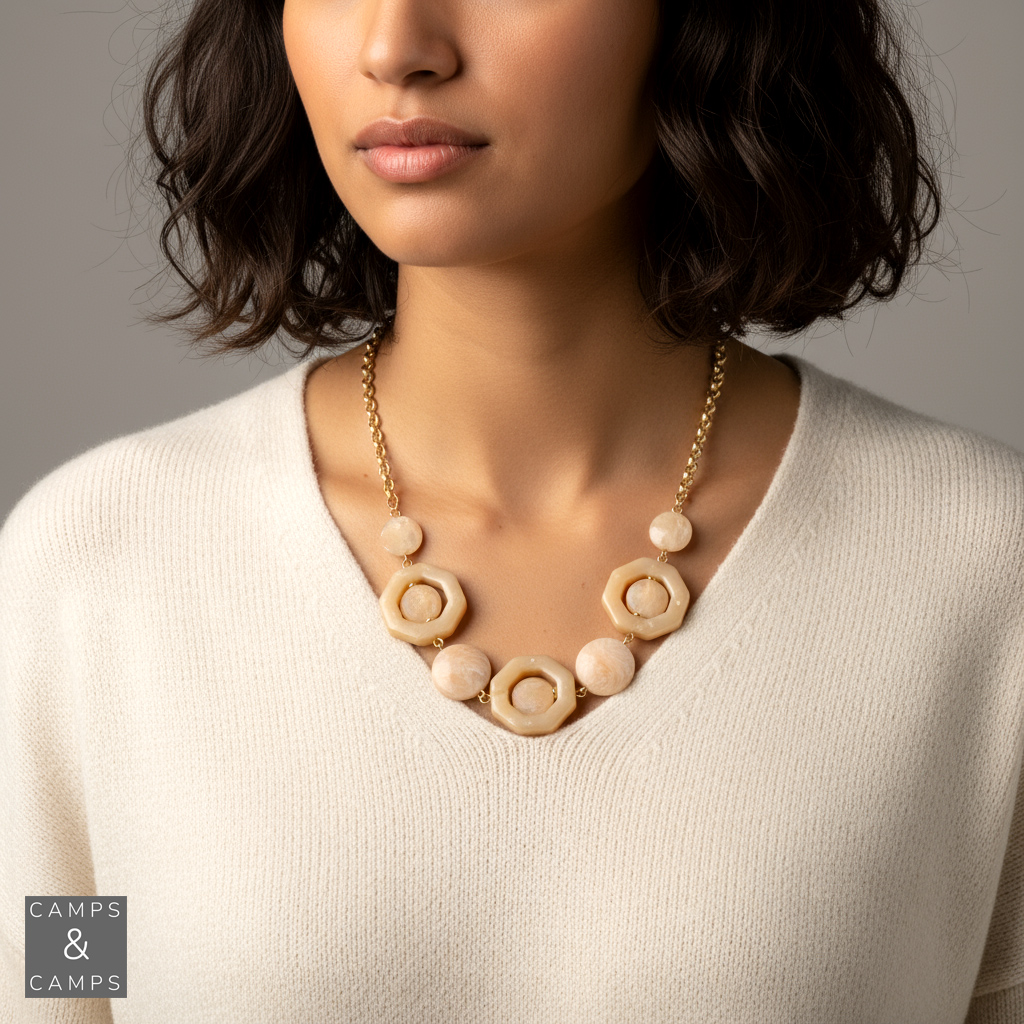 Deze ketting straalt tijdloze elegantie uit. De subtiele vormen en kosmische glans maken het een sieraad dat moeiteloos opvalt en bij elke look past.