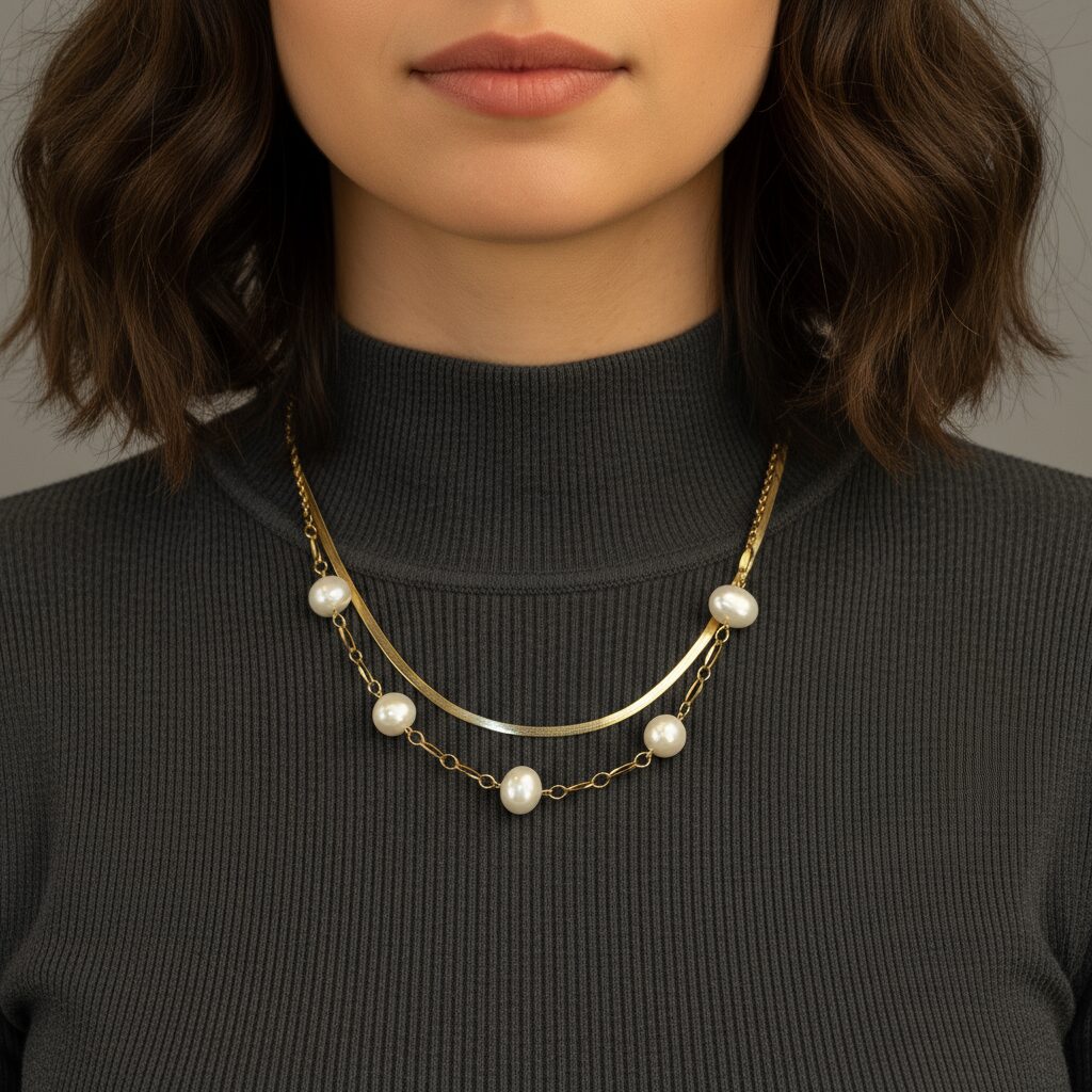 Hoe mooi is deze Double Chain and Pearls Necklace? De ketting is de perfecte combinatie tussen chic, feminine en speels. Combineer de parelketting met al onze andere sieraden voor een complete look! De ketting is gemaakt van stainless steel, dus is waterproof en verkleurt niet!