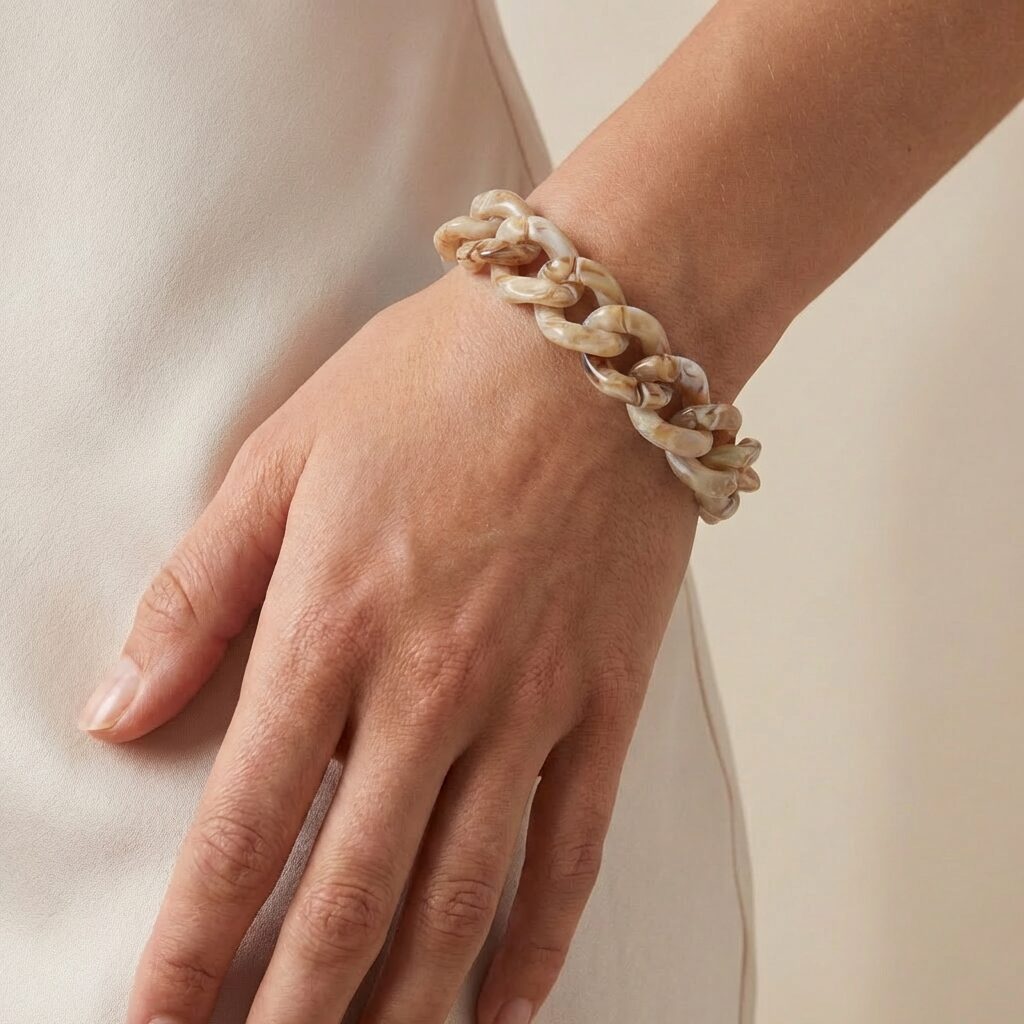 Deze armband combineert een vlakke vorm met een krachtige uitstraling. De brede schakels en verfijnde details zorgen voor een moderne en stijlvolle look die direct opvalt. Leuk om te combineren met bijpassende oorhangers.
