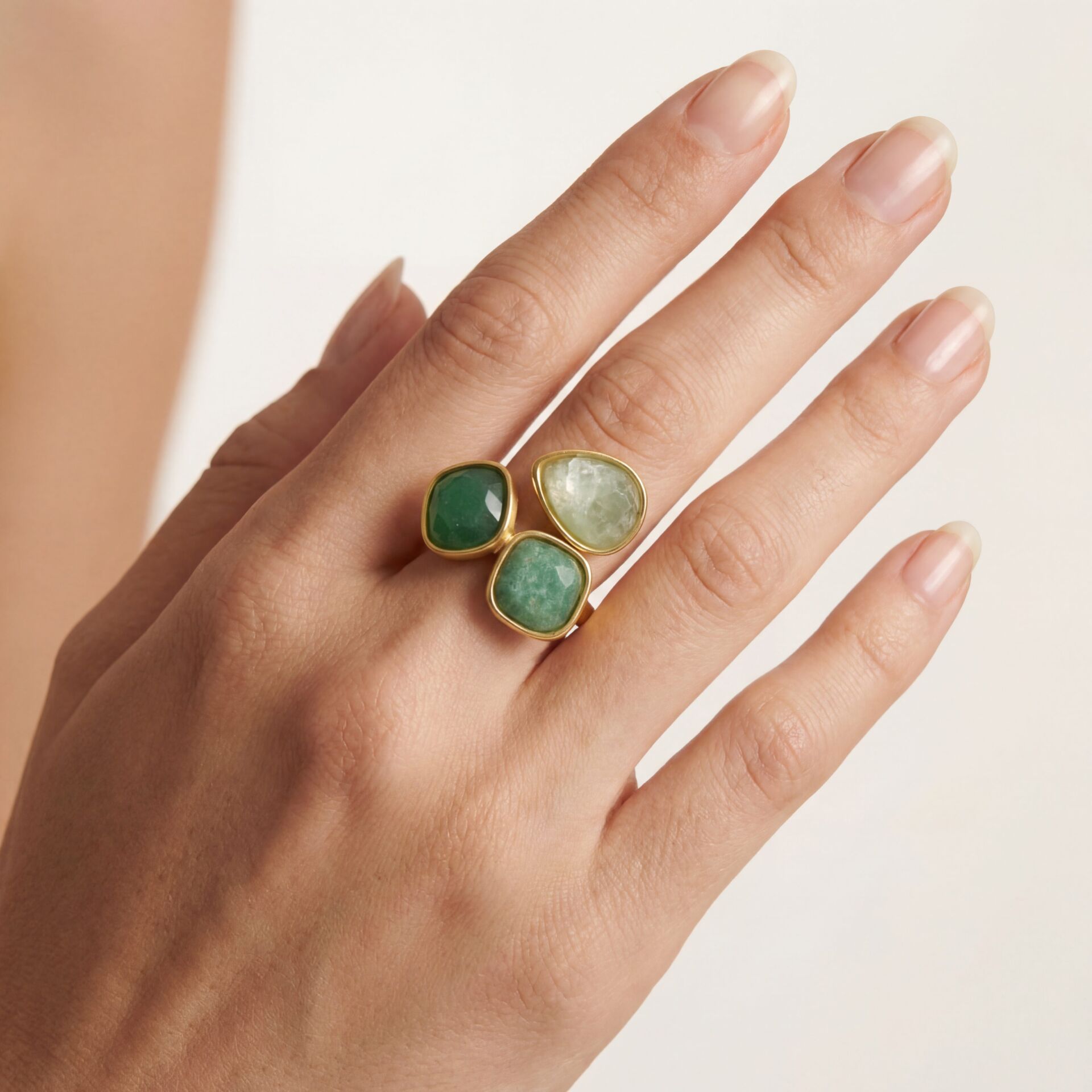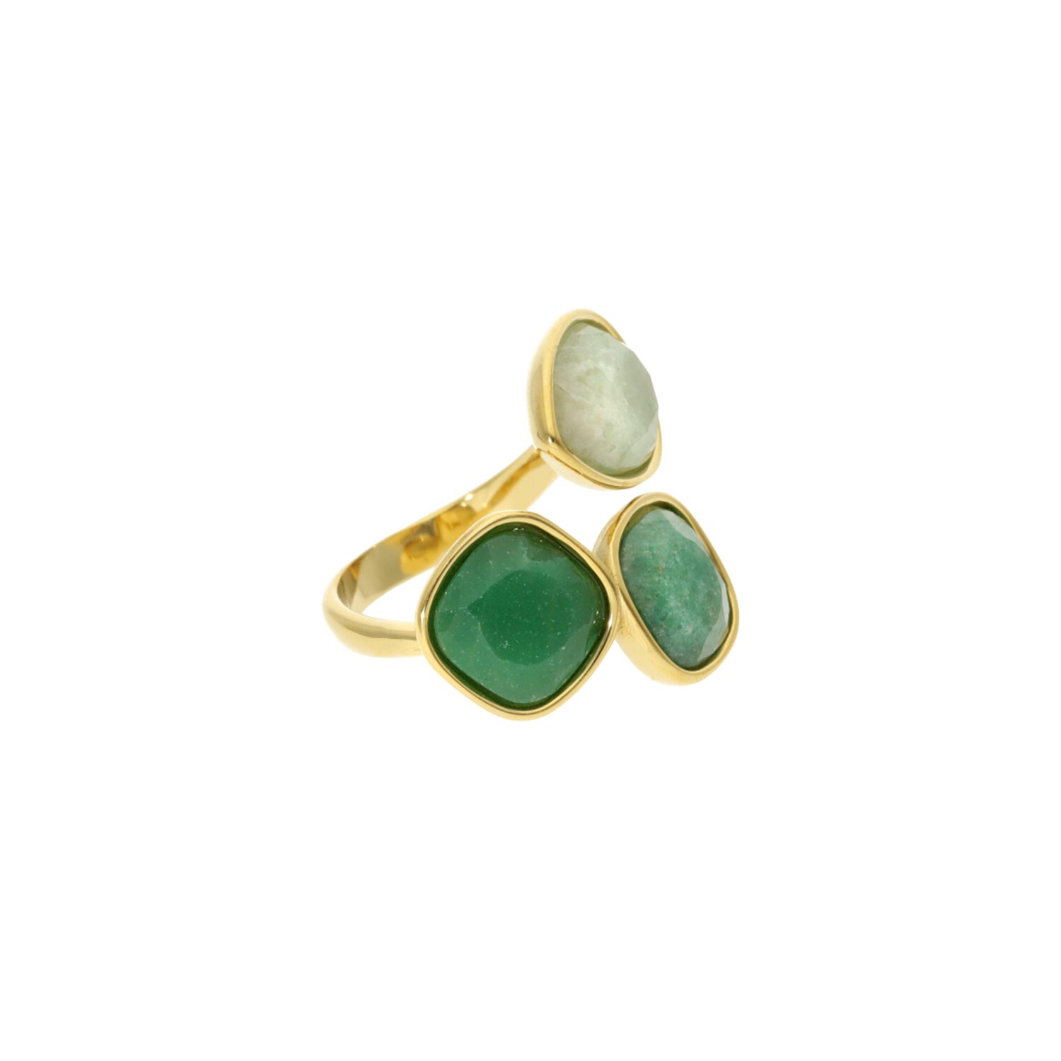 Deze ring heeft drie unieke, natuurlijke stenen van aventurijn edelsteen, elk met hun eigen subtiele glans en karakter. Perfect om te combineren met onze andere ringen voor een speelse en persoonlijke ring party. De ring is verstelbaar en past van maat 17,5 t/m 19. Gemaakt van stainless steel, dus waterproof en verkleurt niet!